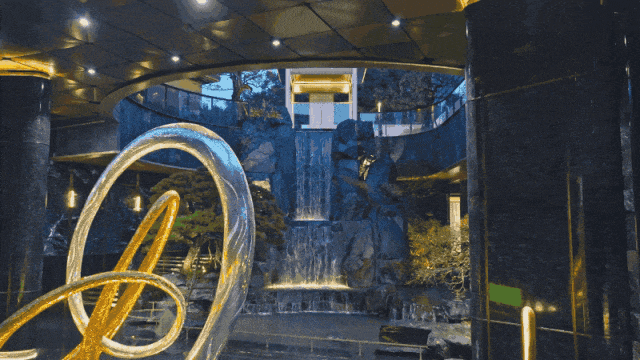来到入口第一眼,约7米高隐奢门庭如画卷般在眼前展开,一座施华洛世奇中国应用中心定制的安云雕塑高高耸立,43000片黄金、白金金箔为底,82000颗水晶钻石做饰,搭配喷泉轻柔如丝,璀璨交相辉映,营造梦幻般的氛围,见此你就读懂了何为“显赫的具象化”。
